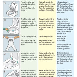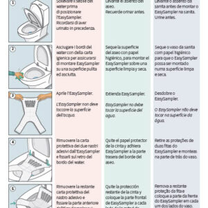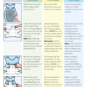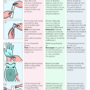 User instruction 6 pages in A5 format with illustrations and descriptive text in American English, Canadian French and Latin American Spanish for each step in the stool collection and mailing process.