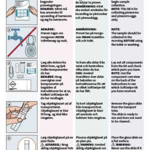 User instruction 8 pages in A5 format with illustrations and descriptive text in Danish, Swedish and English for each step in the pinworm collection and mailing process.