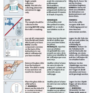 User instruction 8 pages in A5 format with illustrations and descriptive text in English, French and German for each step in the pinworm collection and mailing process.